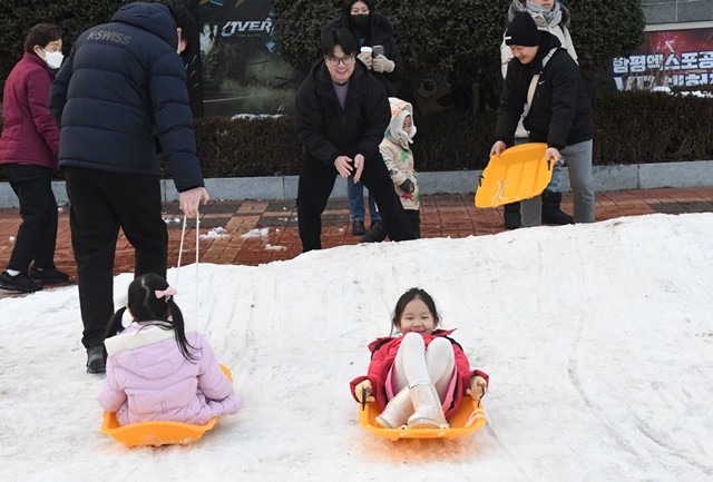 지난 2일 밤사이 내린 폭설이 공원 전역을 순백의 설경으로 물들이며 축제의 분위기를 한층 끌어올렸다. 특히 함평축제관광재단,관광정책실 직원들이 직접 조성한 자연 눈썰매장은 아이들의 웃음소리로 가득 찼다. 아이들은 저마다 썰매를 타고 눈 위를 힘차게 미끄러지며 겨울방학의 소중한 추억을 쌓았다.