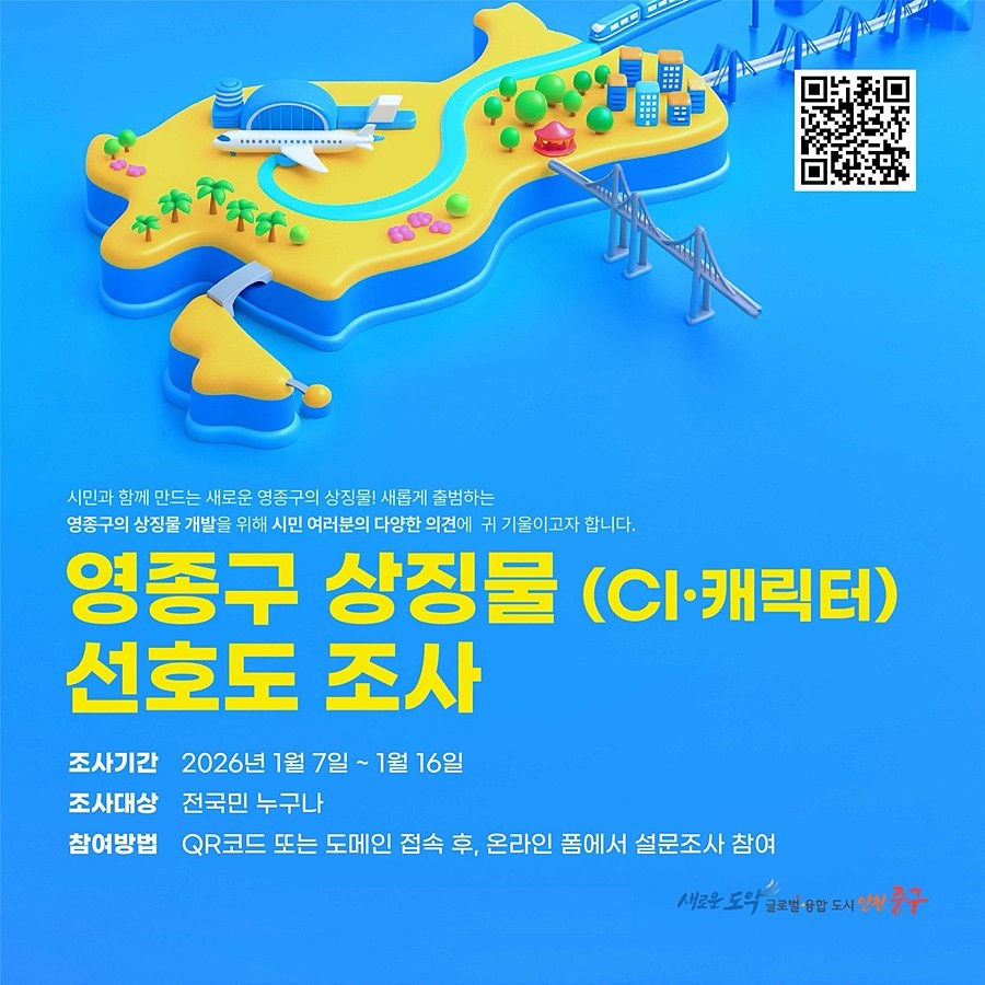 김정헌 구청장은 “주민과 함께 만드는 상징물을 통해 영종구만의 고유한 정체성을 확립하고 경쟁력 있는 도시브랜드를 구축하겠다”라며 “구민 여러분의 소중한 의견이 반영될 수 있도록 적극적인 참여를 바란다”라고 당부했다.