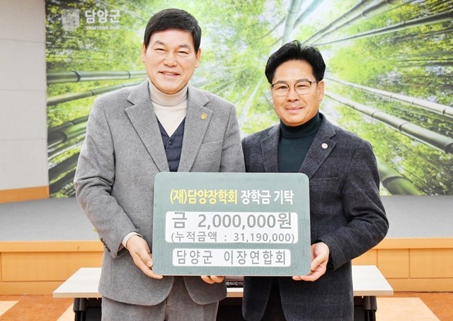 담양군 12개 읍·면 이장들로 구성된 담양군 이장연합회는 지역사회와 상생하는 나눔을 실천하고자 지난 2009년부터 현재까지 3,100만 원의 장학금을 꾸준히 기탁해 오고 있으며, 올해도 새해의 시작과 함께 담양군의 발전과 미래 인재 양성을 기원하는 마음을 한데 모아 장학금을 마련했다.
