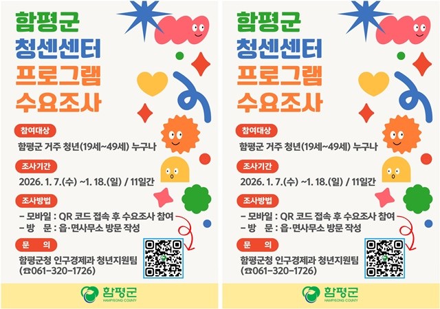 함평군 관계자는 "이번 설문조사는 청년들의 삶의 질을 높일 수 있는 '진짜 배움'을 만들기 위한 첫 단추"라며 "여러분의 의견이 곧 정책이 되는 만큼, 청년들의 적극적인 참여와 참신한 아이디어를 기다린다"고 전했다.
