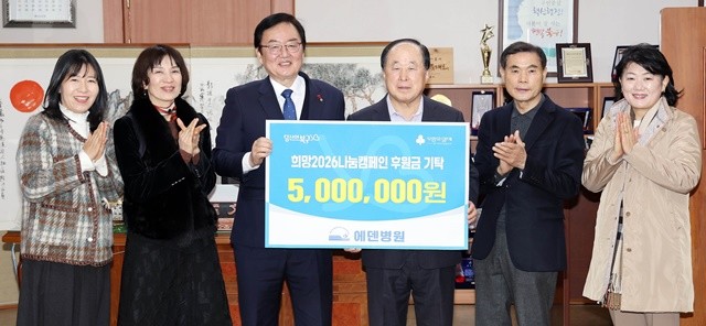 [위키트리 광주전남취재본부 노해섭 기자]광주시 북구(청장 문인)는 7일 청장실에서 새해를 맞아 에덴병원(대표원장 허 정·오른쪽 세번째)으로부터 지역 돌봄이웃들을 위한 희망2026나눔캠페인 사랑의 후원금 500만원을 기탁받았다.