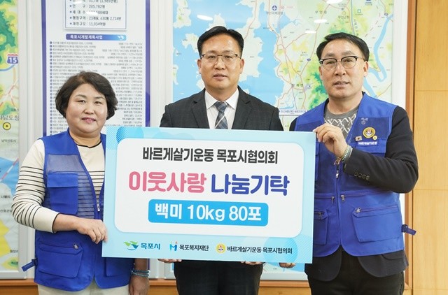[위키트리 광주전남취재본부 노해섭 기자]바르게살기운동 목포시협의회(회장 김용배)는 지난 8일 지역사회 취약계층 지원을 위해 백미 10kg 80포를 목포복지재단에 기탁했다.
