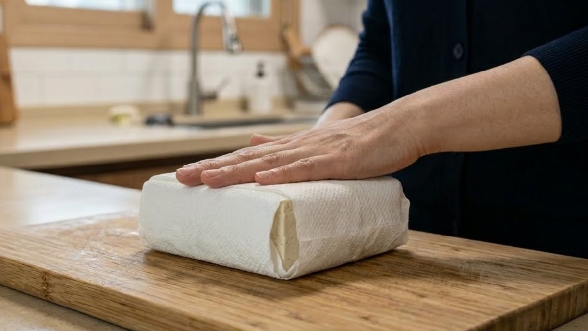 두부 역시 스팸과 비슷한 크기로 6등분 한다. 두부에는 소금을 살짝 뿌려 10분 정도 절여두는데, 이는 두부 속 수분을 빼줄 수 있다. 시간이 지나면 키친타월로 두부 겉면의 물기를 꼼꼼히 닦아준다. 물기를 잘 제거해야 전분이 고르게 붙고, 구웠을 때도 모양이 흐트러지지 않는다.
