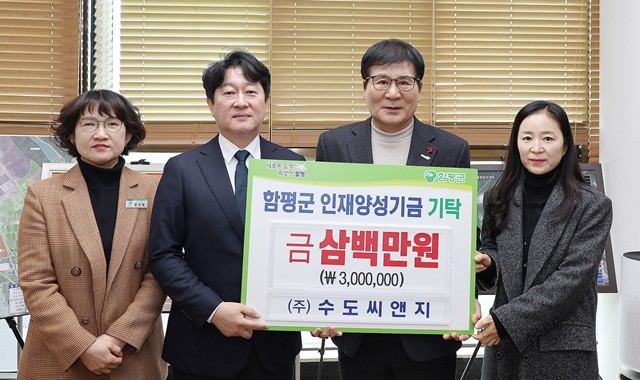함평군은 지난 9일, 관내 상하수도 설비 전문 업체인 ㈜수도씨앤지(대표 엄필성)가 지역의 미래를 이끌어갈 학생들을 위해 써달라며 인재양성기금 300만 원을 기탁했다고 12일 밝혔다.