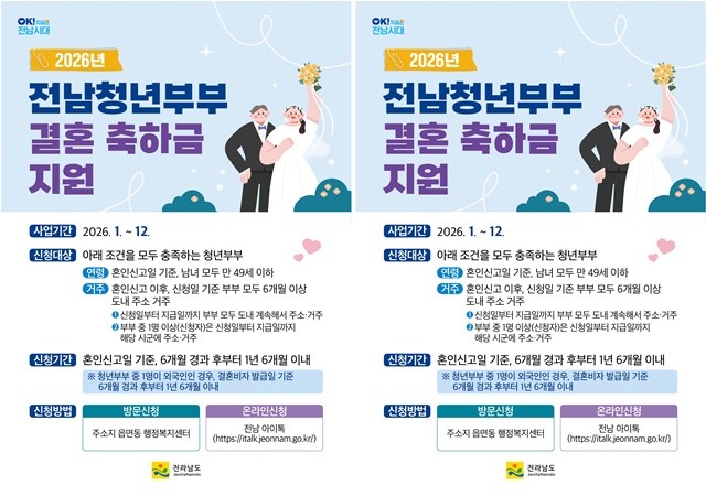 [위키트리 광주전남취재본부 노해섭 기자] 결혼 준비로 지갑이 얇아진 전남 지역 신혼부부들에게 반가운 소식이 도착했다. 전라남도가 도내 정착을 돕기 위해 부부당 200만 원의 축하금을 지급한다.