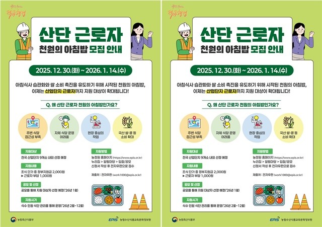 박상미 전남도 농식품유통과장은 “고물가 시대에 식비 부담이 큰 중소기업 근로자를 위해 아침과 점심 식비 지원을 확대하고, 건강한 식습관 형성과 쌀 소비 확대에 기여하도록 최선을 다하겠다”며 “산업단지 입주기업에서도 사업에 적극 참여하길 바란다”고 말했다.