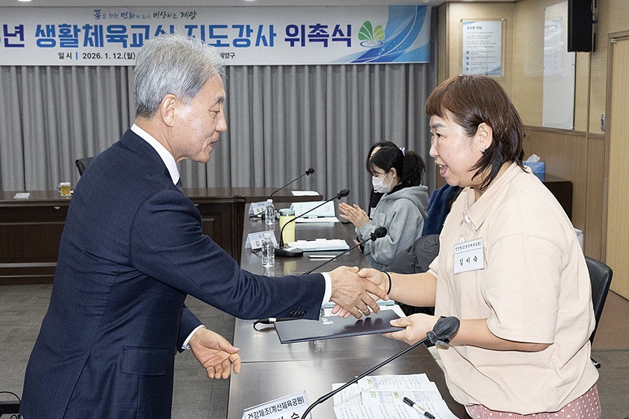 인천광역시 계양구(구청장 윤환)는 1월 12일 구청 영상회의실에서 2026년 생활체육교실 지도강사에게 위촉장을 수여했다고 밝혔다.