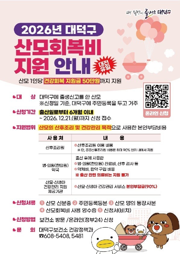 신청은 출산 후 6개월 이내에 가능하며, 신분증, 주민등록등본, 산모 명의 통장 사본, 사용 영수증 등을 지참해 대덕구보건소를 방문하거나 정부24를 통해 온라인으로 신청할 수 있다.