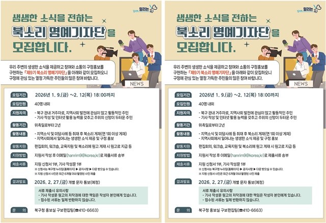 문인 북구청장은 “북소리 명예기자단은 주민이 직접 지역의 변화와 일상을 전하는 메신저인 만큼 이번 모집에 많은 관심과 참여를 바란다”며 “앞으로도 북소리가 주민과 행정의 소통 창구 역할을 할 수 있도록 다양한 지원을 아끼지 않겠다”고 말했다.