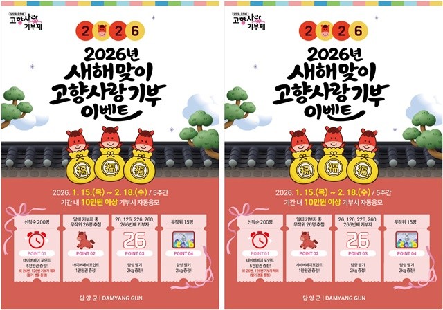[위키트리 광주전남취재본부 노해섭 기자] 담양군(군수 정철원)이 2026년 병오년(丙午年) ‘붉은 말의 해’를 맞아 1월 15일부터 2월 18일까지 5주간 고향사랑기부 이벤트를 실시한다.