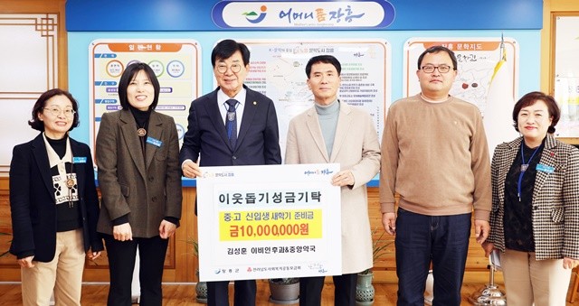 [위키트리 광주전남취재본부 노해섭 기자] 장흥군 김성훈 이비인후과(김성훈 원장)와 중앙약국(박정민 약사)이 14일 저소득가정 중·고등학교 신입생을 위해 1,000만 원을 기부했다.