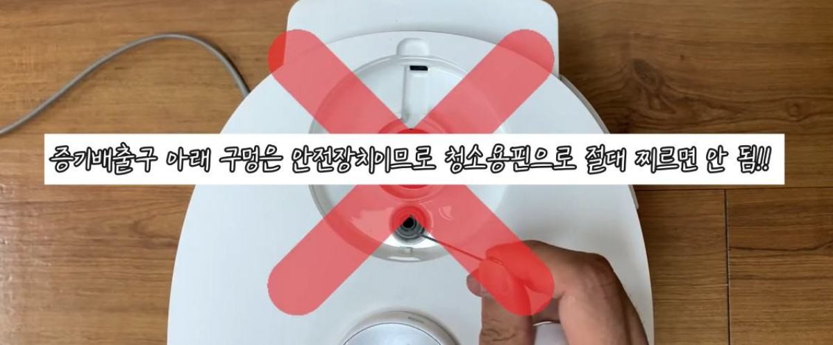 전원은 반드시 완전히 차단하고 밥솥이 충분히 식은 뒤 작업한다. 밥솥을 뒤집어 바닥 홈에 꽂힌 청소핀을 꺼낸다. 뚜껑 위 스팀캡을 분리하고, 그 안의 압력추를 들어 올리거나 안내 방향으로 돌려 빼면 증기 배출구가 드러난다. 이 구멍에 청소핀을 천천히 넣어 위아래로 여러 차례 움직여 통로를 관통시킨다. 반대편으로 핀이 나오는지 확인하면 막힘 여부를 판단할 수 있다.