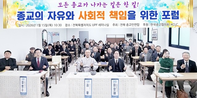 전북종교인연합(상임공동의장 허종현 이상재 혜광스님)은 한국종교협의회(회장 홍윤종)와 KCLC가 후원하는 가운데 15일 전주시 덕진구 안덕원로 소재 전북UPF 세미나실에서 종교지도자와 각계 지도자 등 50여명이 참석한 가운데 ‘종교의 자유와 사회적 책임을 위한 포럼’을 개최했다.