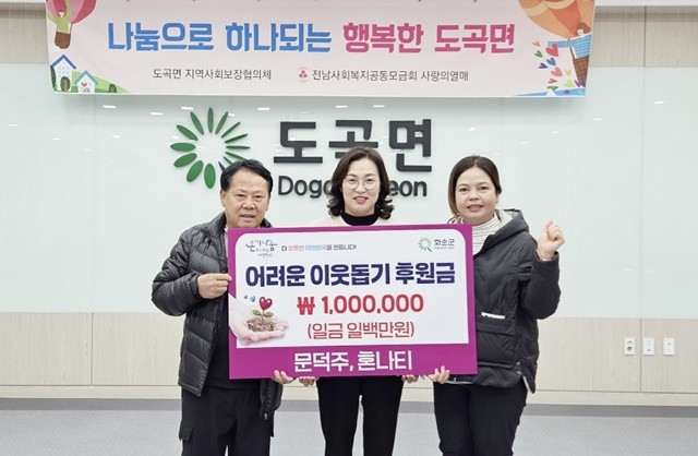 [위키트리 광주전남취재본부 노해섭 기자]화순군 도곡면(면장 김수진)은 지난 14일 관내에 거주하는 문덕주·혼나티 부부가 지역 내 어려운 이웃을 위해 100만 원을 도곡면 지역사회보장협의체에 기부했다고 밝혔다.
