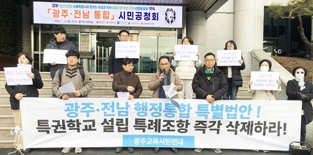 광주YMCA, 참교육학부모회 등 9개 단체로 구성된 광주교육시민연대는 19일 성명을 내고 “행정통합 특별법안의 교육 특례 조항들이 학교 서열화를 부추기고 공교육 생태계를 파괴할 우려가 크다”며 해당 조항의 즉각적인 삭제를 촉구했다.