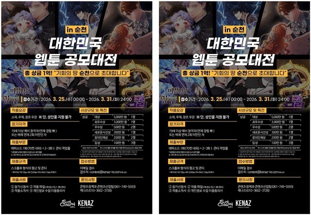 시 관계자는 “이번 공모대전은 전국의 신인 창작자들에게 웹툰 데뷔의 발판을 마련해 줄 뿐 아니라, 순천시가 웹툰 산업의 새로운 거점으로 자리매김하는 계기가 될 것”이라며 “많은 창작자들의 도전과 참여를 기대한다”고 말했다.