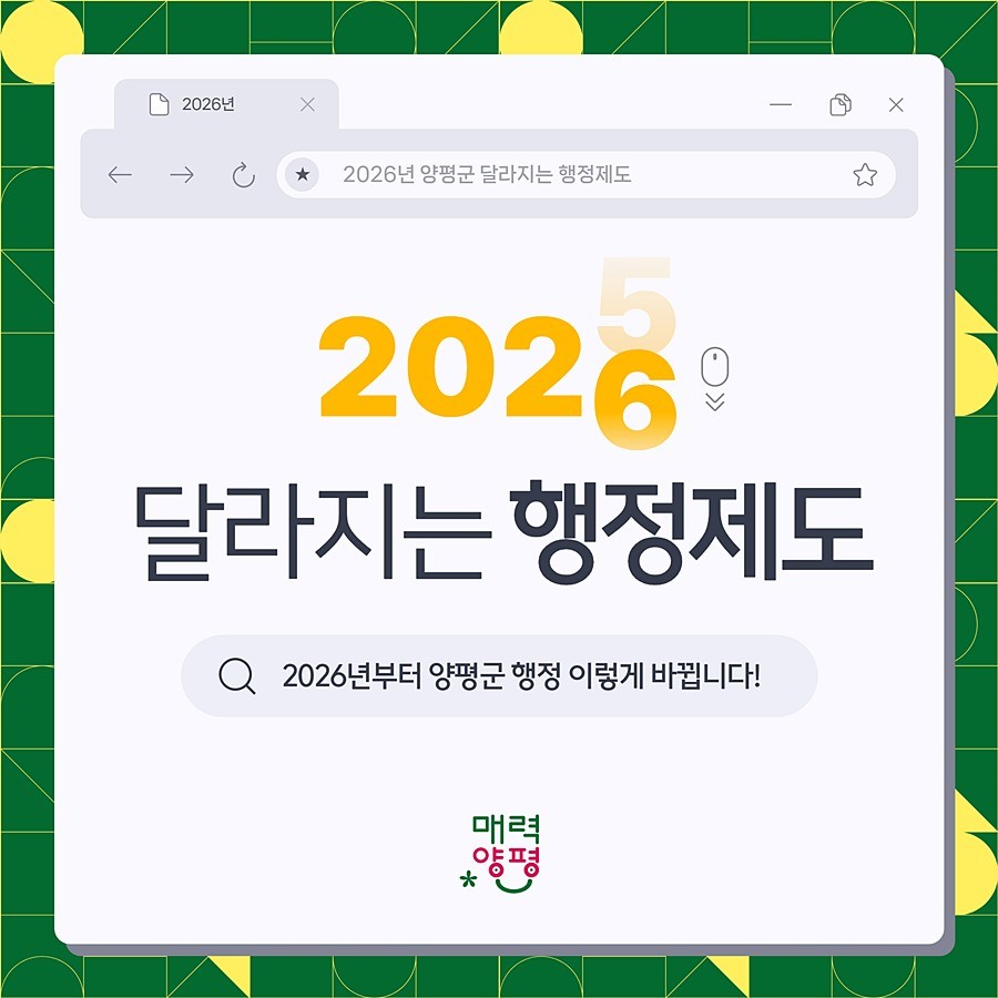 한편, ‘2026년 양평군 달라지는 행정제도 안내’에 대한 자세한 내용은 양평군 공식 블로그(https://m.blog.naver.com/yangpyeong63/224149019369)를 통해 확인할 수 있다.