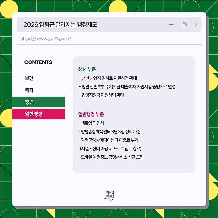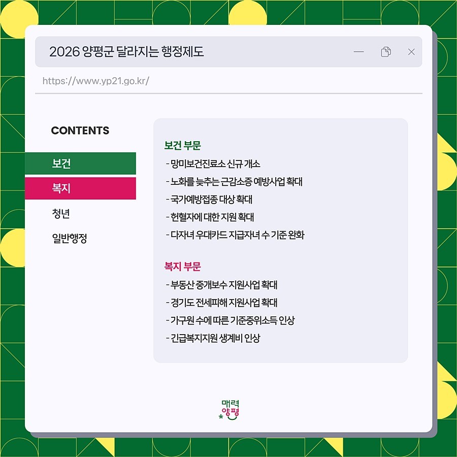 경기 양평군(군수 전진선)은 지난 16일, 2026년 새해를 맞아 보건·복지·청년·일반행정 분야의 행정제도를 확대·개선해 군민 생활 전반에 보다 촘촘한 지원과 체감도 높은 행정을 추진한다고 밝혔다.