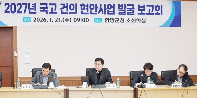 함평군은 지난 21일 군청 소회의실에서 이상익 군수 주재로 ‘2027년 국고 건의 현안 사업 발굴 보고회’를 갖고 본격적인 예산 확보 전략 수립에 나섰다. 이날 테이블에 오른 사업은 총 42건, 전체 사업비 규모만 5,675억 원에 달하는 매머드급이다.