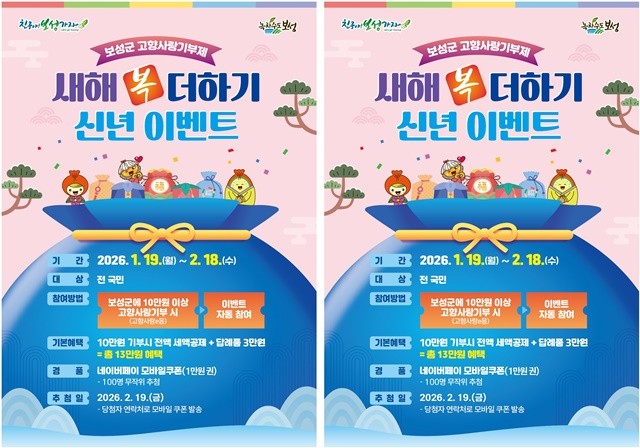 [위키트리 광주전남취재본부 노해섭 기자]보성군(군수 김철우)이 2026년 새해를 맞아 세금도 아끼고 고향 사랑도 실천하는 ‘일석삼조’의 기회를 마련했다. 기부금 전액을 돌려받는 것은 물론, 지역 특산품에 추가 경품까지 챙길 수 있는 특별 이벤트가 열린다.