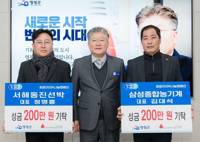 [위키트리 광주전남취재본부 노해섭 기자]영광군(군수 장세일)은 지난 20일 서해동진선박(대표 정명홍)과 삼성종합농기계(대표 김대석)가 각각 성금 200만 원을 기탁하며 ‘희망2026 나눔캠페인’에 동참했다고 밝혔다.