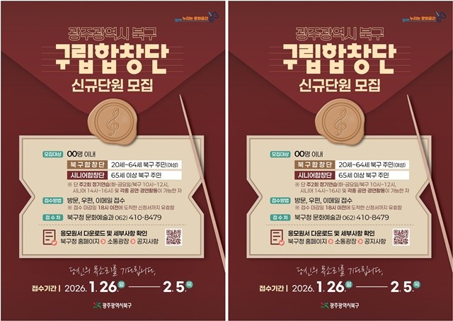 문인 북구청장은 “구립합창단은 지역의 문화예술 발전과 주민들의 정서 함양에 앞장서고 있는 단체”라며 “재능과 끼가 넘치는 주민들의 적극적인 참여를 바란다”고 말했다.