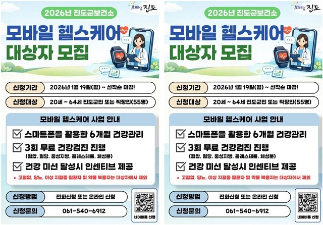 [위키트리 광주전남취재본부 노해섭 기자]진도군은 지난 19일부터 군민들이 건강한 생활 습관을 형성할 수 있도록 ‘2026년 모바일 헬스케어 1기’ 대상자 55명을 선착순으로 모집하고 있다.