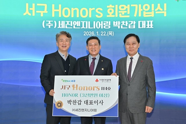 [위키트리 광주전남취재본부 노해섭 기자]광주시 서구(구청장 김이강)는 22일 서구청 1층 기부자 명예의 전당에서 ㈜세진엔지니어링 박찬갑 대표이사의 서구아너스 회원 가입식을 가졌다. 광주 서구 제공
