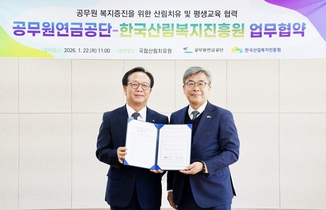 공무원연금공단은 22일 한국산림복지진흥원과 업무협약(MOU)을 맺고, 전·현직 공무원의 정서 안정과 삶의 질 향상을 위한 공동 협력 체계를 구축했다고 밝혔다.