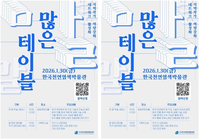 재단은 오는 1월 30일 한국천연염색박물관에서 지역 작가의 전문성 강화와 창작 교류 활성화를 위한 역량 강화 네트워킹 행사 ‘말 많은 테이블’을 개최한다고 23일 밝혔다.