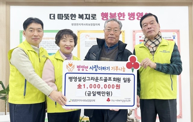 병영설성그라운드골프 회원들은 병영면 지역사회보장협의체에 성금 100만 원을 기탁하며 지역사회와 상생하는 뜻을 전했다. 기탁식에는 설성그라운드골프 백형대 회장과 병영면 지역사회보장협의체 양은희‧김용관 공동위원장이 함께해 나눔의 의미를 더했다.
