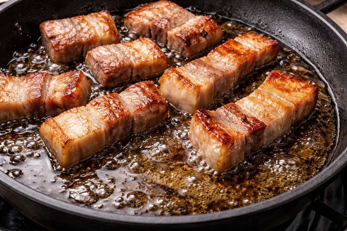 전분은 열을 받으면 일부가 덱스트린처럼 변하며 고소한 향을 보태고 삼겹살에서 나온 기름과 결합해 바삭한 크러스트를 만들면서 입안에서 지글지글한 고기 맛이 더 또렷하게 느껴지게 한다. 같은 삼겹살이라도 전분을 더한 뒤에는 겉면이 살짝 두툼하고 바삭하게 잡혀, 기름이 주는 느끼함이 덜하게 느껴지고 고기 향이 더 선명하게 올라오는 경우가 많다.