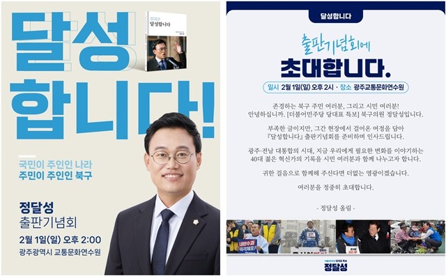 [위키트리 광주전남취재본부 노해섭 기자]정달성 광주시 북구의원(더불어민주당 당대표 특보)이 저서 "달성합니다"를 펴내고 시민들과 소통의 자리를 마련한다.