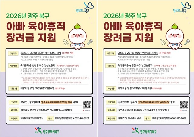 25일 북구에 따르면 오는 26일부터 ‘2026년 아빠 육아휴직 장려금’ 신청이 시작된다.