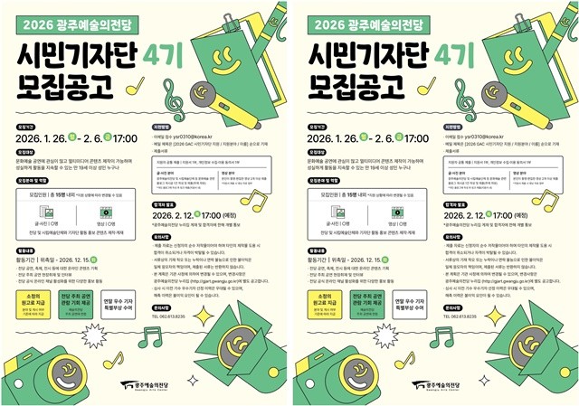 [위키트리 광주전남취재본부 노해섭 기자]광주광역시 예술의전당은 전당의 다양한 공연 정보와 문화 소식을 직접 취재하고 공식 온라인 채널을 통해 알릴 ‘2026 광주예술의전당 시민기자단 4기’를 26일부터 2월6일까지 모집한다.