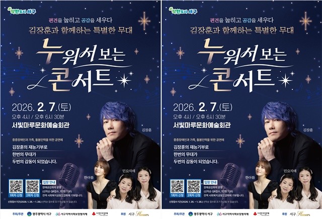 서구는 가수 김장훈과 고액 기부자 모임 ‘서구아너스’와 함께 오는 2월7일 서빛마루문화예술회관에서 배리어프리 공연 ‘김장훈의 누워서 보는 콘서트’를 개최한다고 밝혔다.