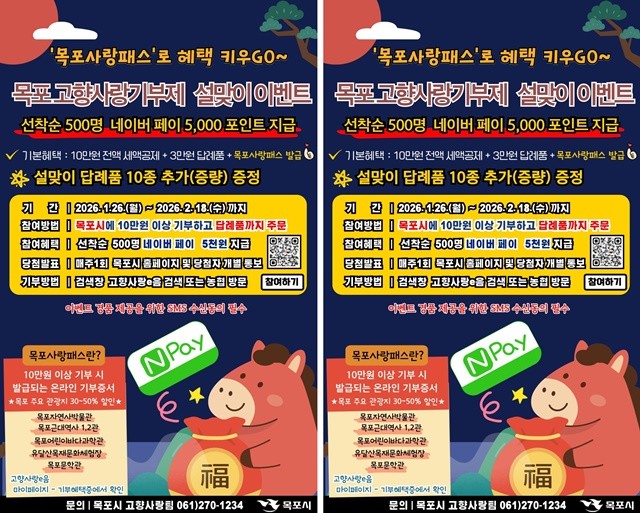 시 관계자는 “설 명절을 맞아 목포에 깊은 애정을 보내주신 기부자 여러분께 감사의 마음을 전하고자 이번 이벤트를 준비했다”며 “기부자 가정에 건강과 행복이 가득한 복된 한 해가 되길 바라며, 2026년에도 목포 고향사랑기부제에 많은 관심과 응원을 부탁드린다”고 말했다.