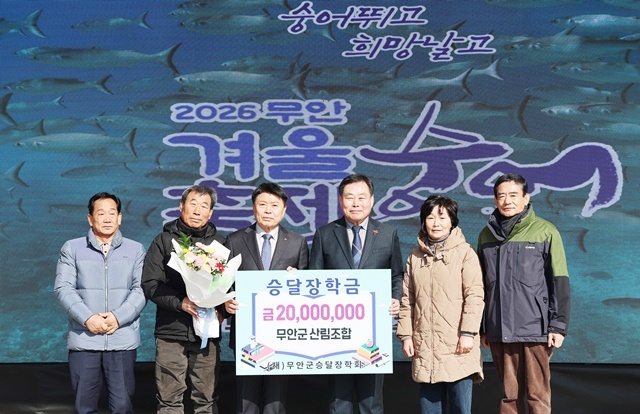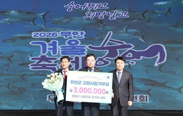 무안군(군수 김산)은 지난 24일 열린 ‘2026 무안겨울숭어축제’를 계기로 영암군 산림조합 임직원들이 지역 간 상생 발전과 기부문화 확산을 위해 무안군 고향사랑기부금 300만 원을 기탁했다고 밝혔다.