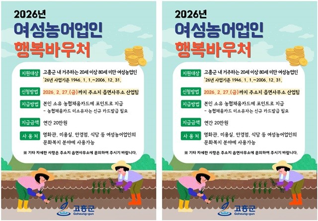 [위키트리 광주전남취재본부 노해섭 기자]고흥군(군수 공영민)은 여성 농어업인의 문화·여가 활동을 돕기 위해 ‘2026년 여성농어업인 행복바우처 지원사업’ 신청을 오는 2월 27일까지 주소지 읍·면사무소에서 접수한다고 밝혔다.