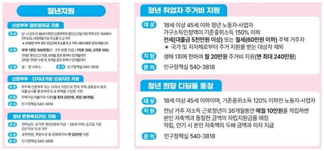 이 밖에도 ▲청년 취업자 전세·월세 지원(월 20만 원, 최대 1년) ▲신혼부부·다자녀 가정 보금자리 지원(주택 구입 대출이자 3년간 지원) ▲청년 희망 디딤돌 통장 사업(월 10만 원 매칭 적립, 3년) ▲청년 문화복지카드 지원(연 25만 원) ▲청년 생활공구 무료 대여 사업 등을 통해 주거와 자산 형성, 생활 편의를 종합적으로 지원하고 있다.
