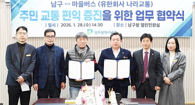 [위키트리 광주전남취재본부 노해섭 기자] 광주시 남구(구청장 김병내)는 28일 오후 구청 열린민원실에서 (유)나라교통과 주민들의 교통 편익 증진을 위한 업무 협약을 체결했다.