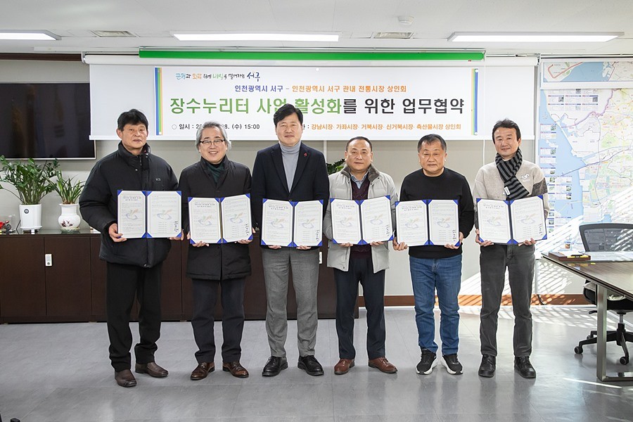 인천 서구(구청장 강범석)는 지난 28일 인천광역시 서구 전통시장 상인회와 서구민의 건강한 노후를 지원하고 지역사회 돌봄 체계를 구축하기 위한 ‘장수누리터 사업 활성화’ 업무협약을 체결했다.