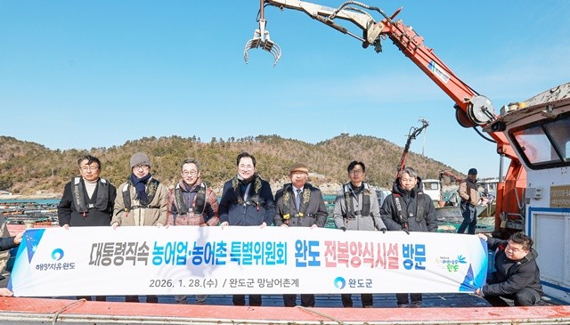 완도군은 지난 28일 대통령 직속 ‘농어업·농어촌 특별위원회(이하 농특위)’ 김호 위원장과 위원들이 완도읍 망남리 전복 양식장을 방문해 현안을 논의했다고 29일 밝혔다.