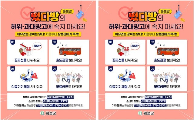또한 피해가 생겼을 경우 식품안전 관련 위법행위는 식품의약품안전처(☎1399), 소비자 피해는 소비자상담센터(☎1372)에서 신고할 수 있으며, 기타 문의는 화순군청 지역경제과로 하면 된다.