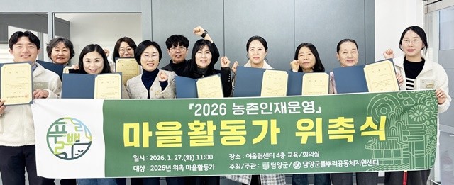 군은 지난 27일 담양군 어울림센터에서 ‘2026년 마을활동가 위촉식’을 열고, 공개 모집과 면접 심사를 거쳐 선발된 활동가들에게 위촉장을 수여했다.