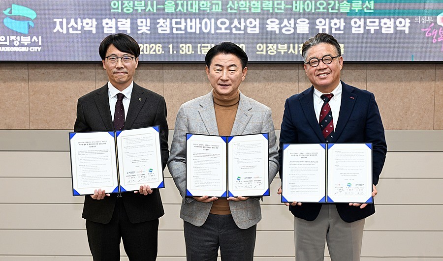 의정부시는 1월 30일 시청 회룡홀에서 을지대학교 산학협력단(단장 김인식), ㈜바이오간솔루션(대표 송명석)과 ‘지산학 협력 및 첨단 바이오산업 육성을 위한 업무협약’을 체결했다.