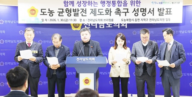 [위키트리 광주전남취재본부 노해섭 기자]전남도의회 도농복합시 농어촌 지역구 도의원들이 전남·광주 행정통합과 관련해, 도농 균형발전을 제도적으로 보장할 것을 촉구하고 나섰다.