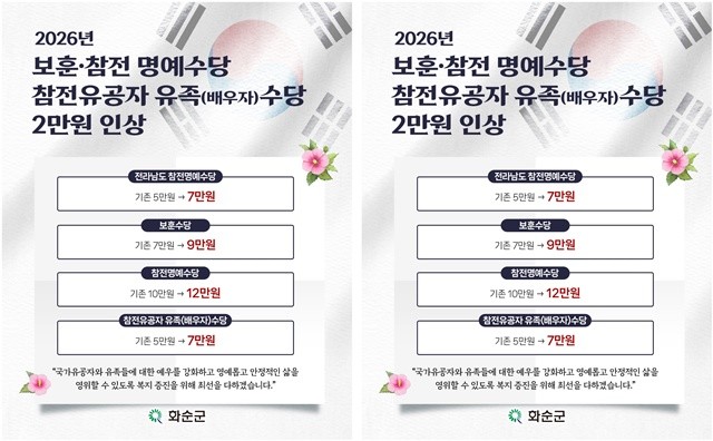 이번 인상 대상은 ▲화순군 보훈수당 ▲화순군 참전명예수당 ▲화순군 참전유공자유족(배우자)수당 ▲전라남도 참전명예수당 등으로 각각 매월 2만 원씩 인상된다.