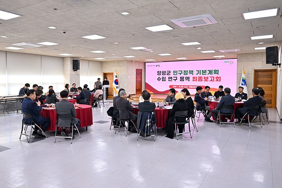 경기 양평군(군수 전진선)은 지난 30일 군청 대회의실에서 전진선 양평군수를 비롯해 오혜자 양평군의회 의장, 인구정책위원, 인구정책 관련 부서장, 용역 수행기관 관계자 등 40여 명이 참석한 가운데 ‘양평군 인구정책 기본계획 수립 연구용역 최종보고회’를 개최했다.