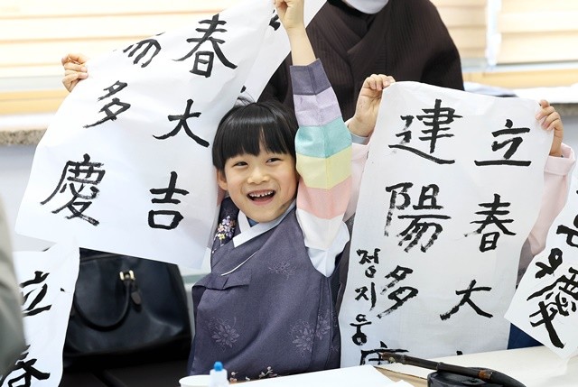 할아버지의 다정한 설명에 아이들은 신기한 듯 눈을 반짝이며 서툰 솜씨로 ‘입춘’ 두 글자를 따라 그렸다.